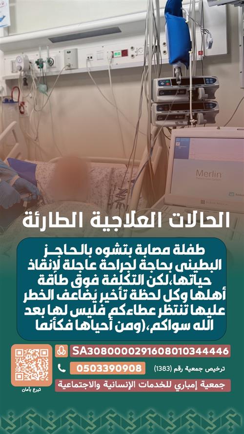 طفلة مصابة بتشوه بالحاجز البطيني بحاجة لجراحة عاجلة لإنقاذ حياتها،لكن التكلفة فوق طاقة أهلها وكل لحظة تأخير يُضاعف الخطر عليها تنتظر عطاءكم فليس لها بعد الله سواكم،(ومن أحياها فكأنما أحيا الناس جميعا)