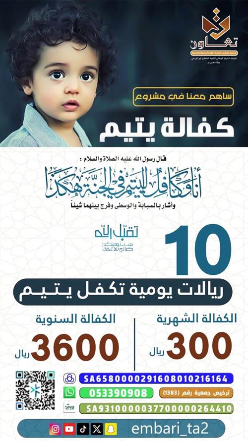قال رسول الله ﷺ: "أنا وكافل اليتيم في الجنة هكذا" وأشار بالسبابة والوسطى. كفالة اليتيم باب عظيم للخير وسبب للبركة في المال والولد، فهي صدقة جارية تجلب السعادة في الدنيا والآخرة. اجعل لك بصمة في حياة هؤلاء الأطفال الأيتام، تكن لك دعوة مستجابة وسعادة لا تزول. مد يد العون اليوم، واغتنم هذا الباب العظيم من أبواب الجنة.