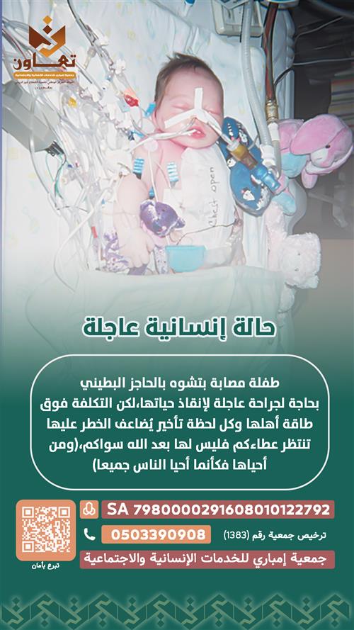 طفلة مصابة بتشوه بالحاجز البطيني بحاجة لجراحة عاجلة لإنقاذ حياتها،لكن التكلفة فوق طاقة أهلها وكل لحظة تأخير يُضاعف الخطر عليها تنتظر عطاءكم فليس لها بعد الله سواكم،(ومن أحياها فكأنما أحيا الناس جميعا)